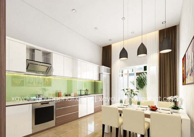 Tổ hợp phòng bếp + phòng ăn được thiết kế đầy đủ và tiện lợi đặc biệt là tủ Acrylic bóng gương hiện đại. Bàn ăn được bố trí ngăn nắp, thuận tiện cho việc sinh hoạt của chủ nhà. Thiết kế hệ thống đèn trần nhỏ gọn tạo sự ấm cúng cho không gian mỗi khu cả gia đình cùng nhau sinh hoạt.
