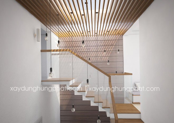 Phía cầu thang lên tầng, Hưng Phát khéo léo sử dụng gỗ màu nâu nhạt và thông tầng thông thoáng, hệ lam kết hợp đèn trần thả rất sang trọng và đẹp mắt. Tuy chỉ là những chi tiết nhỏ nhặt, song nếu biết sử dụng thông minh và khoa học thì không gian sống của bạn sẽ cực kì xinh xắn và sinh động hơn.