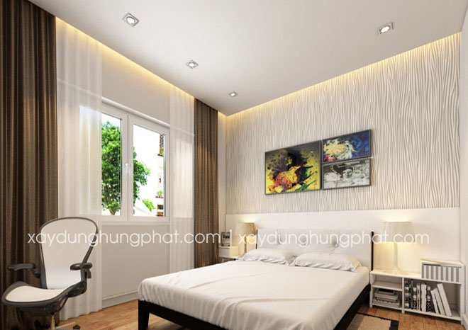 Phòng ngủ dành cho 2 vợ chồng được sử dụng gam màu vàng nhạt, kết hợp bộ giường gỗ nổi bật cùng vách hoa ngăn. Hướng ánh sáng từ phía ban công. Các bức tranh treo tường với sắc màu trang nhã thu hút ánh nhìn người xem.