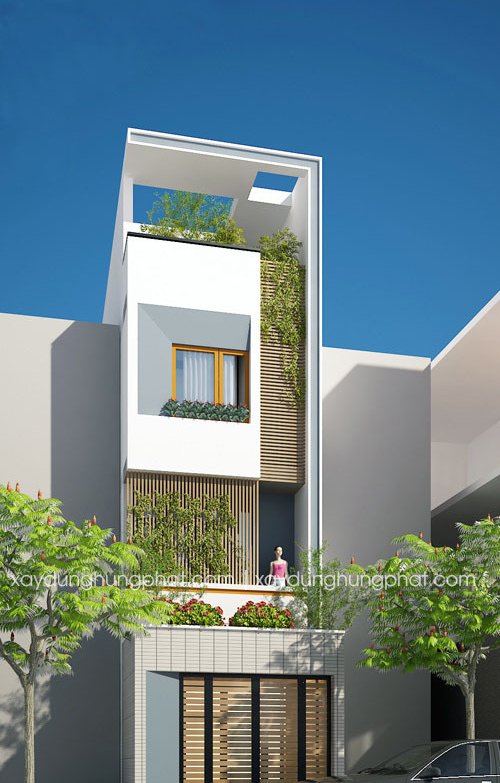 Mặt tiền nhà 4 tầng mái bằng được bố trí các hình khối vuông vức làm tăng sức hút và độ thông thoáng của ngôi nhà. Hệ thông lam màu gỗ kết hợp với không gian xanh từ dây leo quanh nhà giúp giảm bớt bức xạ nhiệt, giảm nắng nóng và tính thẩm mỹ được nâng cao hơn.